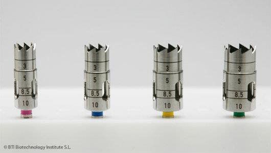 They allow an ultrafine cut along the first 5 millimetres because they are narrower at that level, preserving the surrounding bone. This is particularly important in the case of resorbed maxilla. They are delivered in four different diameters, depending on the width of the implants.